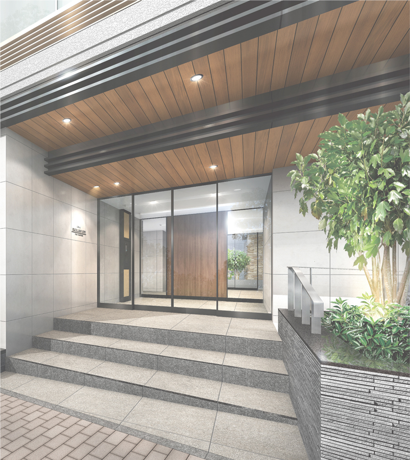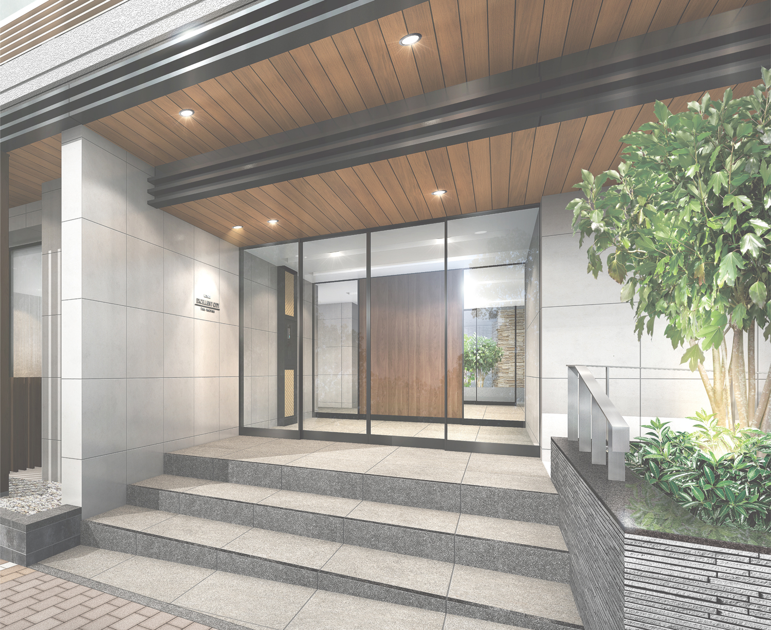 ※掲載の外観完成予想CGは計画段階の図面を基に描いたもので実際とは異なります。なお、外観・内観の細部・設備機器・配管類等は一部省略又は簡略化しております。植栽につきましては特定の季節の状況を表現したものではなく、竣工時には完成予想図程度には成長しておりません。樹種は一部変更になる場合があります。タイルや各種部材につきましては実物と質感・色等の見え方が異なる場合があります。また今後変更になる場合があります。