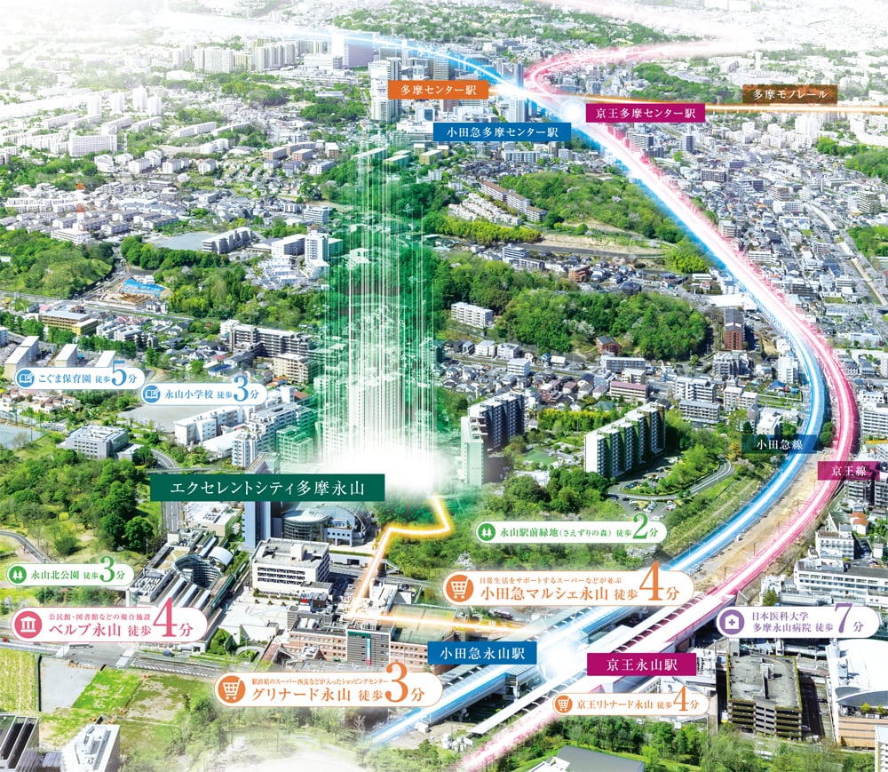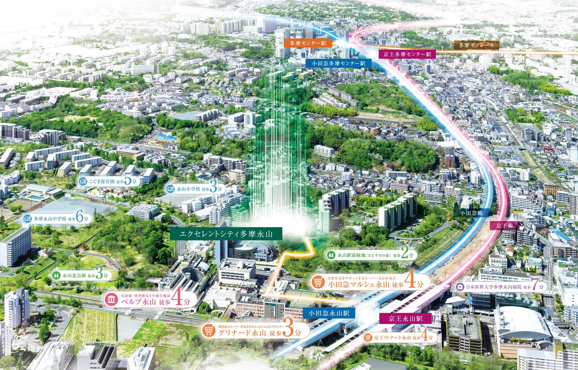※2.京王相模原線「京王永⼭」駅より「新宿」駅へ直通39分:京王相模原線特急利用/「渋⾕」駅へ39分:京王相模原線特急利用、「明⼤前」駅で京王井の頭線急⾏に乗換え