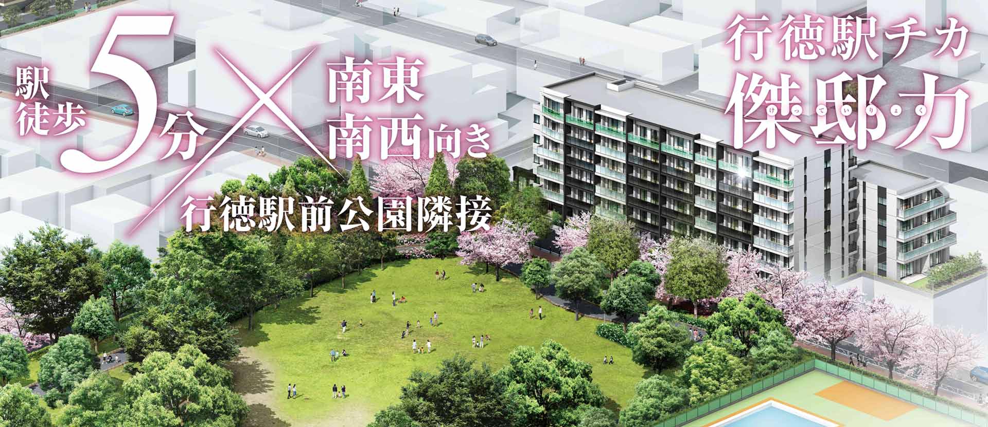 ※掲載のロケーションCGは、現地から「行徳」駅までの距離感を表現したイメージです。周辺建物や電柱・標識・鉄塔などは一部簡略化または透過しております。建物完成予想CGは計画段階の図面を基に描いたもので実際とは異なります。なお、外観の細部・設備機器・配管類等は一部省略または簡略化しております。植栽につきましては特定の季節の状況を表現したものではなく、竣工時には完成予想図程度には成長しておりません。樹種は一部変更になる場合があります。タイルや各種部材につきましては実物と質感・色等の見え方が異なる場合があります。また今後変更になる場合があります。