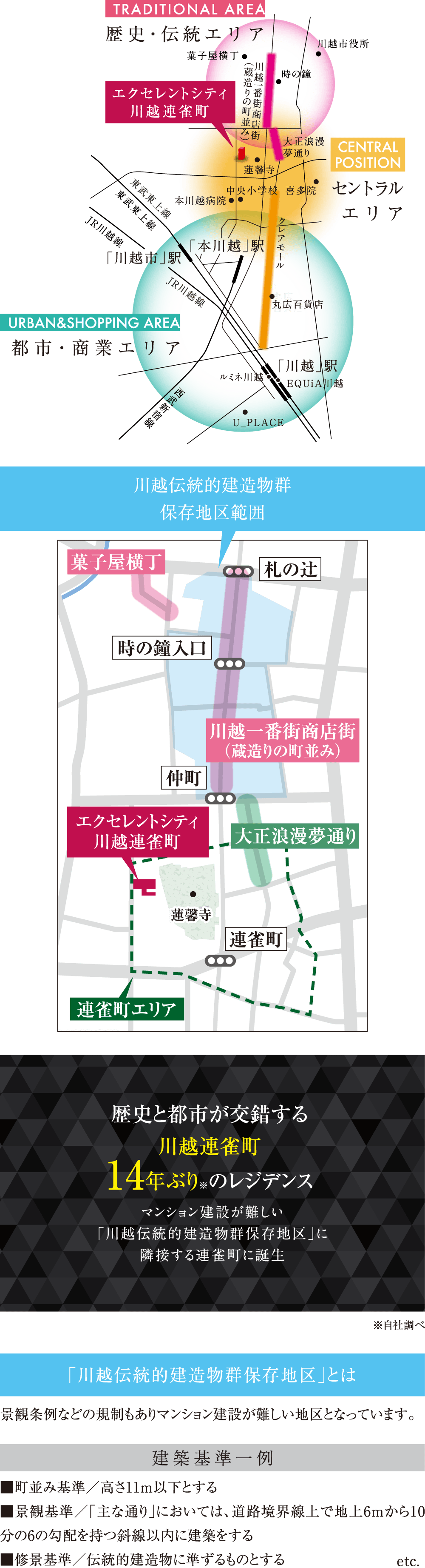 現地の南側エリアには3つの駅と豊富な商業施設が広がり、北側エリアには小江戸・川越を象徴する数々の歴史的なスポットが展開。「エクセレントシティ川越連雀町」は、都市利便性と歴史の情緒という二つの魅力を身近に楽しめる「川越のセントラルポジション」に誕生します。