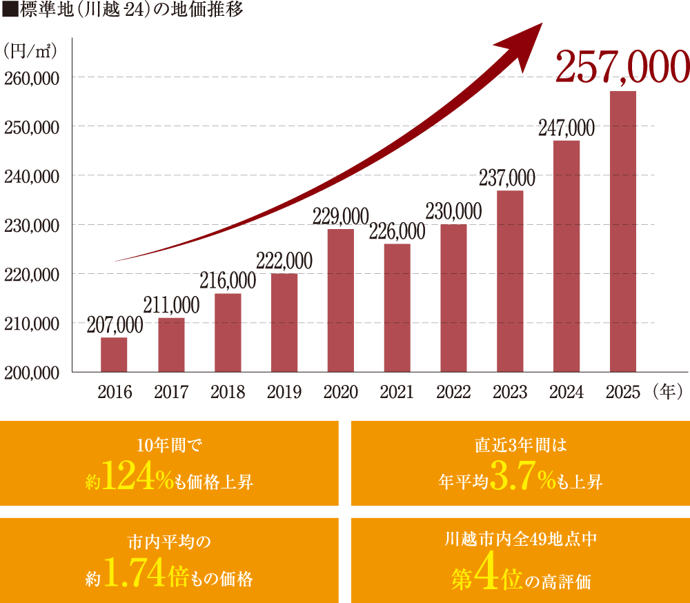 現地最寄りの標準地(川越-24・現地より約130m)の公示地価は近年上昇傾向に。10年前の2016年比で見ると約124%も向上するなど、めざましい成長を示しています。