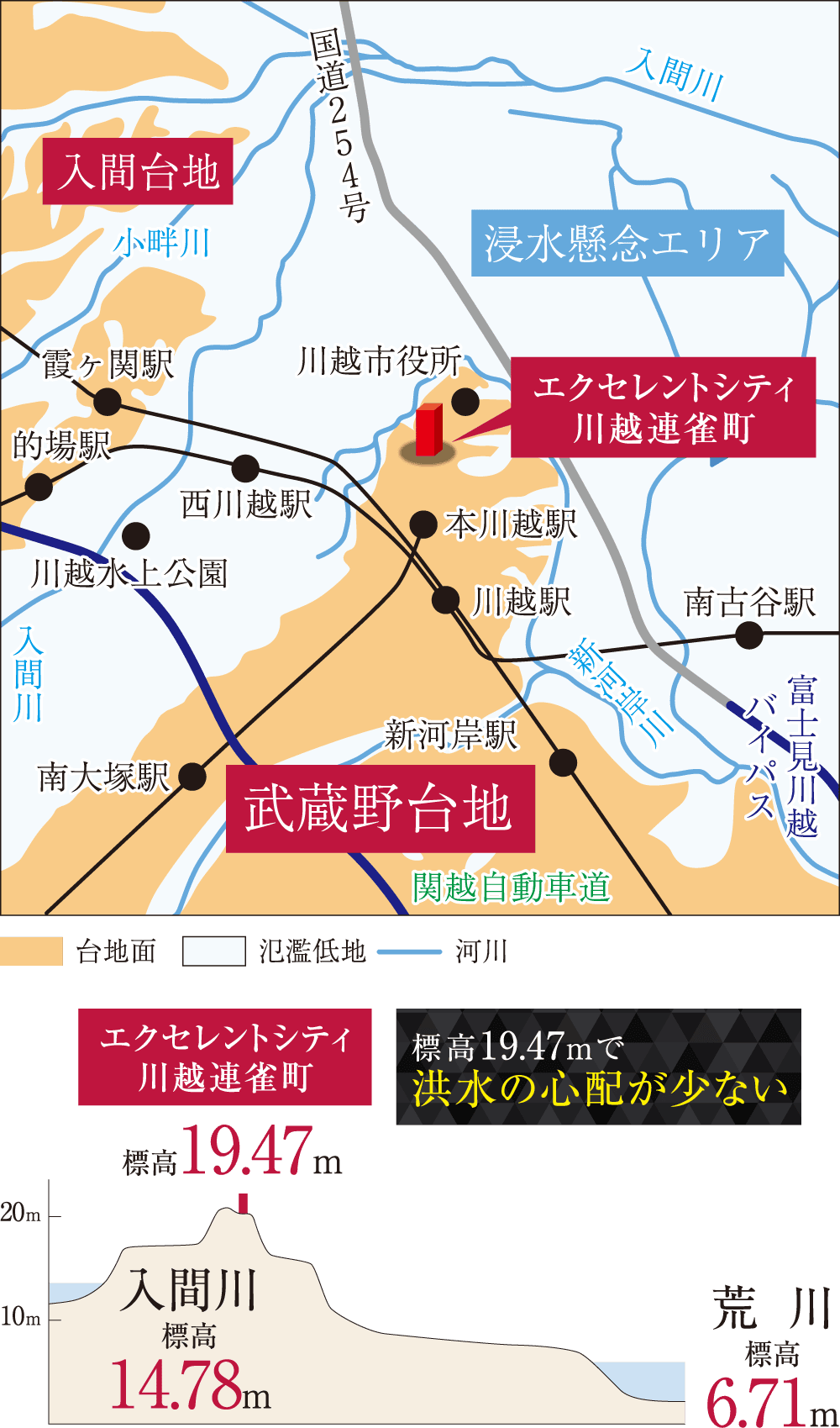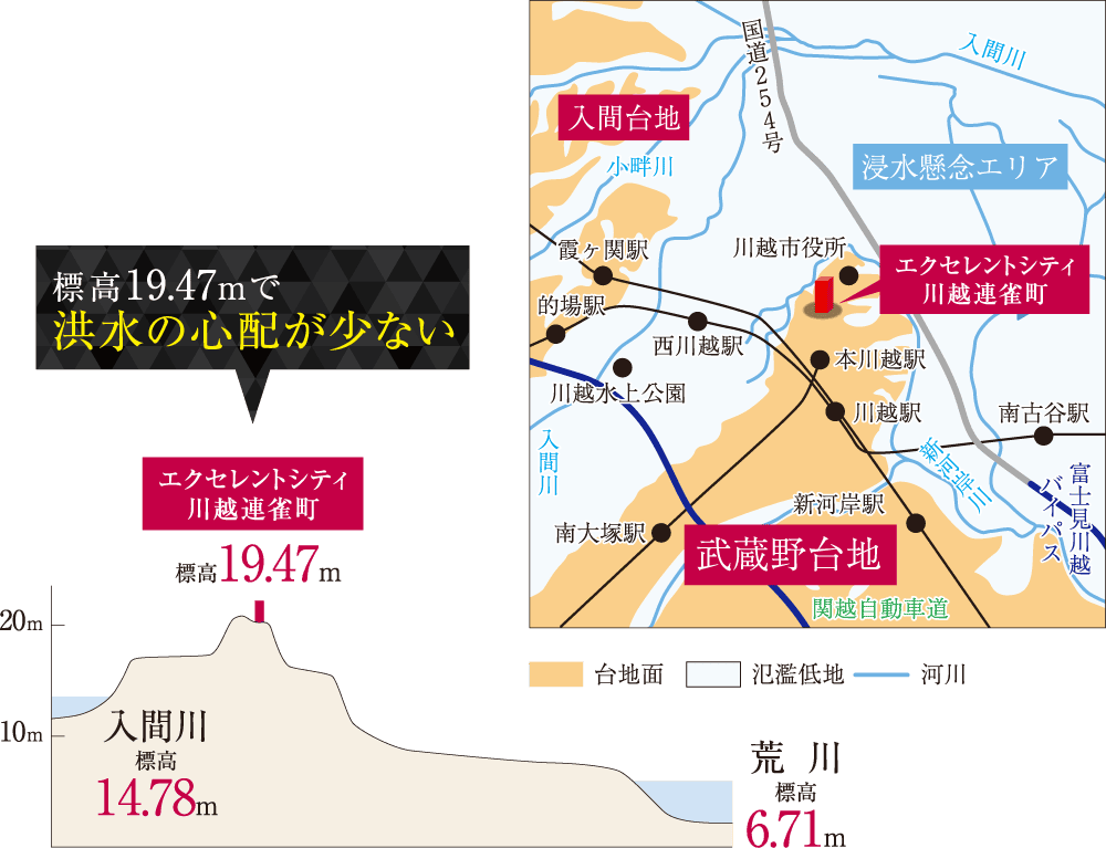 現地周辺は約1万~3万年前の地層から形成された武蔵野台地。長い年月をかけて堆積・固化した地盤のため、優れた安定性を誇るほか、洪水や液状化の心配も少ない安心の地盤となっています。武蔵野台地上に位置する現地周辺一帯は、川越市内に広く分布する河川の氾濫低地エリア外のため、洪水被害も受けにくい地域となっています。