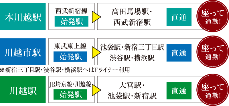 東武東上線、西武新宿線、JR埼京線・川越線と多数の路線と始発便、さらに特急など自由なアクセススタイルを叶える3駅を自在に活用。毎日の通勤・通学はもちろん、週末の街歩きにも軽快なフットワークを与えてくれます。