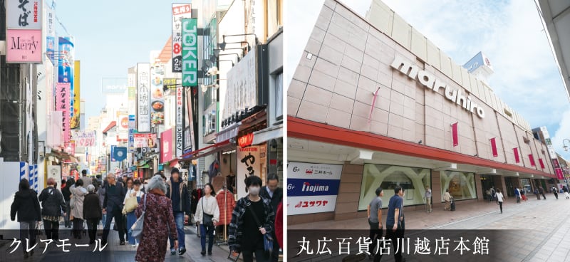 「本川越」駅や「川越」駅周辺には丸広百貨店やアトレ川越をはじめ多彩な商業施設が集積。さらに大型商店街のクレアモールや小江戸の風情を残す川越一番街商店街などが暮らしに利便性と賑わいを運びます。
